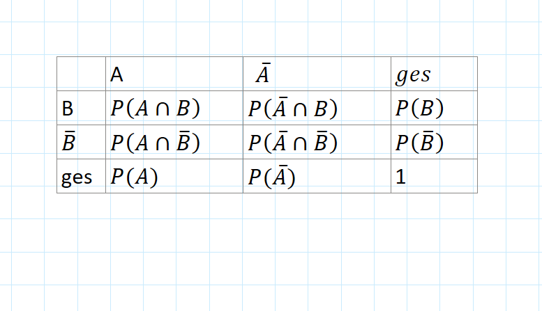 In der Vierfeldertafel siehst du die Wahrscheinlichkeiten von zwei Ereignissen (Urnenmodell). Die Schnittmengen von A und B können nun entweder einen Einfluss durch das erste Ereignis haben (Beispiel: Der Test ist positiv, wenn der Patient infiziert ist) oder nicht (Beispiel: Die zweite Münze zeigt Kopf, wenn die erste Münze Zahl zeigt).
